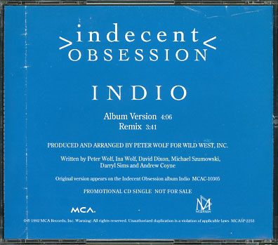 (If you see no auction listings above, clicking the Search button will search eBay Stores listings for the CD single in question.) Return to Main CD Singles List Indecent ObsessionIndio