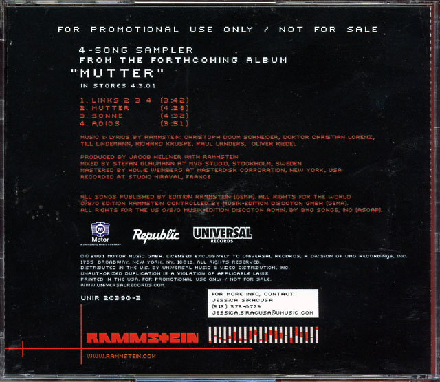 (If you see no auction listings above, clicking the Search button will search eBay Stores listings for the CD single in question.) Return to Main CD Singles List RammsteinMutter Sampler